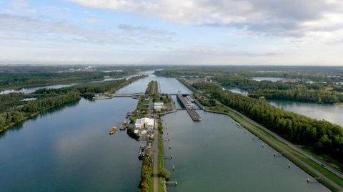 Der Rhein mit der Staustufe Iffezheim bei Baden-Baden