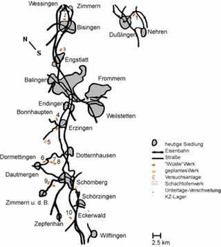 Mehrere Gedenkstätten erinnern an diese sinnlosen Opfer des "totalen Krieges". Weitere Überbleibsel der damaligen Schieferölgewinnung sind: eine ganze Anzahl von KZ-Gebäuden (Schömberg beim Bahnhof), Mauerreste von Betriebsanlagen (Wüste 10 - Zepfenhan, Gedenkstätte Eckerwald), Meiler bzw. in Meilern entstandene Schlacken (Wüste 4 - Erzingen, südlich der Domäne Bronhaupten) und junge Aufforstungen, die im Zuge der Rekultivierung der wüst gefallenen Flächen entstanden. Beim Vergleich alter und neuer topographischer Karten werden darüber hinaus morphologische Veränderungen sichtbar: z.B. Begradigung eines Flußlaufs (Schlichem), Verlagerung von Geländestufen (Bisingen), etc.
