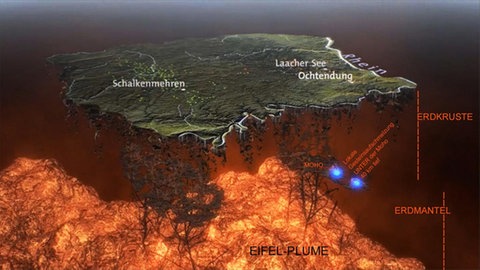Als am Ende der chemischen Umbildung des Magmas der Gasdruck in der Magmakammer zu hoch wurde, brach der Laacher See-Vulkan mit einer unvorstellbar großen Explosionskraft aus. Heute vermutet man, dass lokal begrenzte Aufschmelzungen ein paar Kilometer oberhalb des Eifel-Plumes in nur circa 40 Kilometer Tiefe stattfinden. Hinweise darauf lieferten zwei tiefe Erdbeben im Jahr 2013. Auch erste Stichproben von Gasmessungen deuten auf solche magmatischen Aktivitäten im oberen Erdmantel dicht unter der Grenze zur Erdkruste hin.