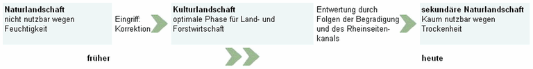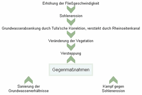 Die Prozesse, die sich im südlichen Oberrheingebiet abspielten sind exemplarisch für ökologische Wirkungsketten. Um sie zu begreifen, muss erst der ehemalige Zustand beleuchtet werden. Der wichtigste ökologische Faktor im Auenwald-Ökosystem war das Wasser. Die Vegetation war auf die regelmäßigen Überflutungen und hohe Grundwasserstände angewiesen. Die Überschwemmungen brachten mit den eingeschwemmten Sedimenten natürliche Düngung, so dass sich außerordentlich üppige Wälder vorherrschten. Die "Bändigung des Rheines" führte zur Trockenlegung der ganzen Landschaft. Der Grundwasserspiegel senkte sich um durchschnittlich acht Meter ab. Altwasserarme verlandeten und da wo ehemals Auenwälder anstanden, siedelten sich trockenheitsliebende Pflanzen an.