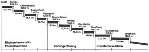 Kembs 1932 - Ottmarsheim 1952 - Fessenheim 1956 - Vogelgrün 1959 - Marckolsheim 1960 - Rhinau 1963 - Gerstheim 1966 - Straßburg 1970 - Gambsheim 1974 - Iffezheim 1977