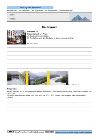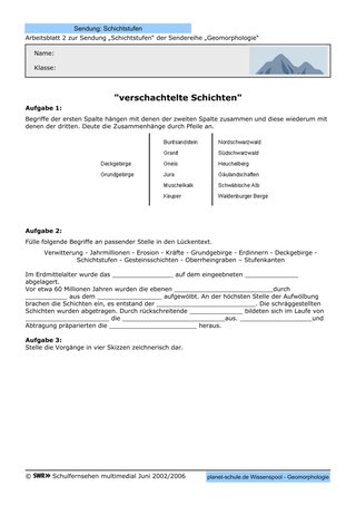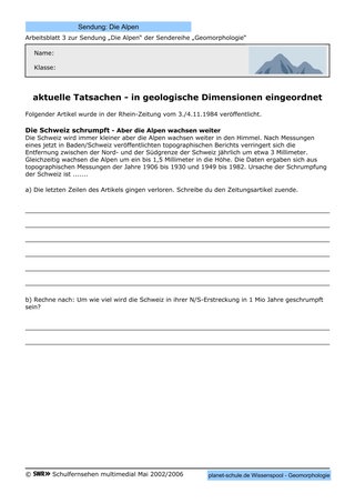 - Landeskundlicher Ansatz (häufig Sek I): der Alpenraum wird behandelt und dabei soll die Entstehung des Gebirges erklärt werden. Obwohl sehr viel Vorstellungsvermögen von den Schülern dieser Altersstufe abverlangt wird, sollte man nicht darauf verzichten, das Thema zu bearbeiten. Erfahrungsgemäß sind die Schülerinnen und Schüler von dem "geologischen Unfall" fasziniert und ebenfalls von dem Gedanken, dass die Schweiz - ein allen bekanntes Reiseland - schrumpft (siehe Material 3).