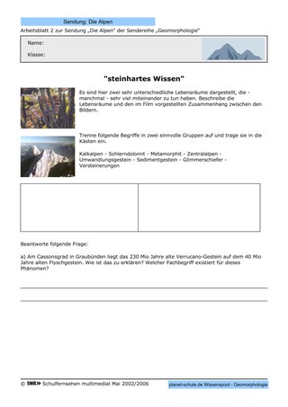 Hält man sich an die drei Grundfragen dieser Folge, kann man den Inhalt der Sendung gut gliedern. Hilfreich dafür sind ebenfalls die Trickfilme, die den doch eher etwas komplizierten Aufbau der Alpen erklären, weshalb man sich bei der Planung des Unterrichts an die Grundfragen und Inhalte der Trickaufnahmen halten sollte. Andere Themenschwerpunkte wie die Gesteinsarten oder auch die Überschiebungstheorie können nachfolgend behandelt werden.