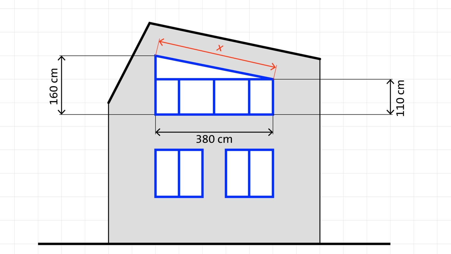Das Spezialfenster eines Bürogebäudes muss ausgetauscht werden. Bestimme, auf welche Länge x (siehe Bild) das Fensterrahmenprofil (bzw. die Oberseite des Fensters) zugeschnitten werden muss.