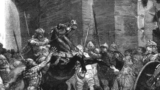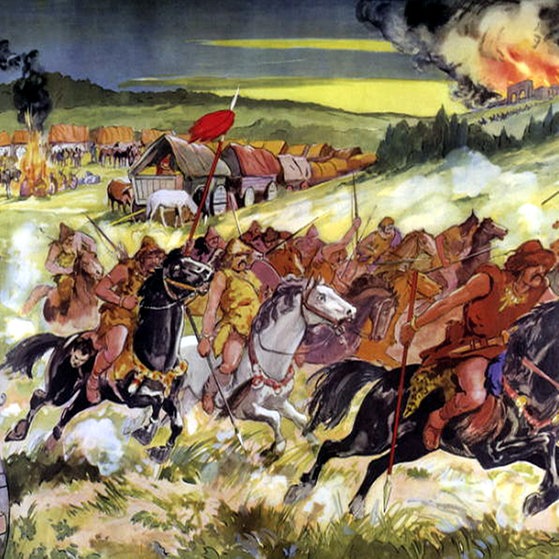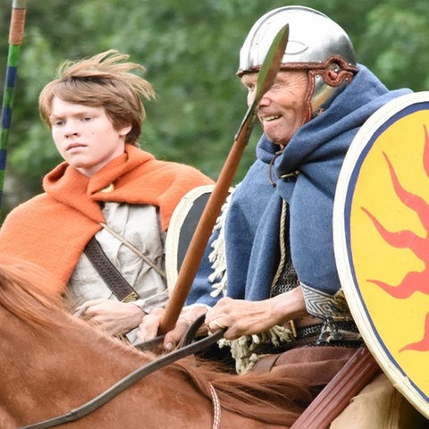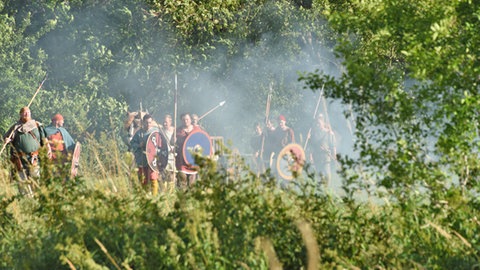 Spielszene von mehreren altertümlich gekleideten Menschen.