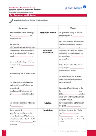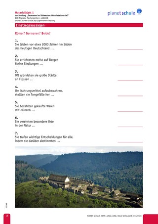 | 5‘ | Lehrkraft: Vorlesen der sieben Aussagen zur Lebensweise von Römern und Germanen, Schülerinnen und Schüler ordnen jeweils zu | Plenum | Einstiegsblatt |
