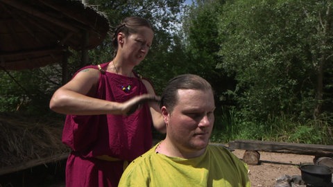 Dass die Germanen im Südwesten reinlich waren, beweist unser Experiment. Aus feingesiebter Buchenholzasche und Ziegentalg stellen wir Seife her, „Seipfa“ wie sie selbst es nannten. Auch die Kleidung webten und färbten die Germanen im Südwesten selbst. Sie benutzten hauptsächlich Wolle und Leinen, liebten kräftige Farben und webten gern „vierbindige Gleichgradköper“. Wir alle tragen diese Stoffart heute noch: mit unserer Jeans!