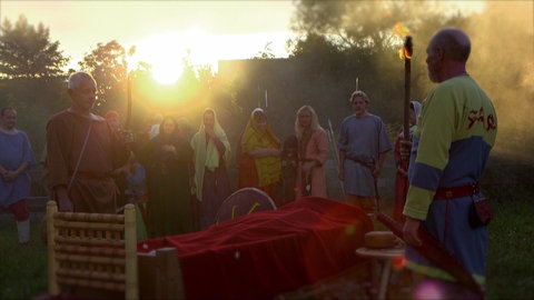 Der Glaube eines Volkes, das uns selbst kaum Schriftquellen hinterlassen hat, ist natürlich schwer zu rekonstruieren. Auch gibt es keine Tempel oder Kirchen, denn so viel weiß man: Die Germanen im Südwesten hatten eine ausgeprägte Naturreligion, verehrten Bäume, Flüsse, Quellen und auch Tiere. Die Bezeichnung der Wochentage geht vermutlich auf die germanische Götterwelt zurück. Der Film beleuchtet anhand des „Sängergrabs von Trossingen“ die germanischen Bestattungsriten. In Experimenten werden Grabbeigaben nachgebaut: eine Leier und verschiedene Holzobjekte.
