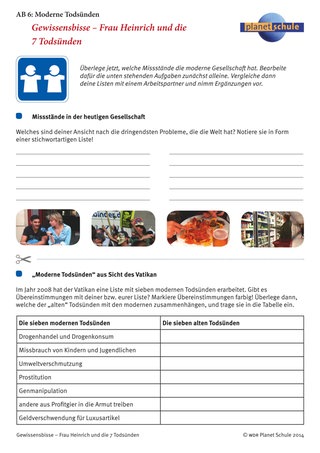 Im Unterrichtsgespräch begründen die Schülerinnen und Schüler ihren eigenen Katalog von Missständen und setzen sich damit auseinander, ob sie die Liste mit den "modernen Todsünden" der katholischen Kirche so übernehmen wollen würden. Arbeitsblatt 6 "Moderne Todsünden" sollte vor dem Verteilen an die Klasse zwischen den beiden Fragestellungen durchgeschnitten werden.