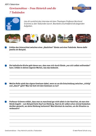 Aus der Sicht der katholischen Kirche ist das Konzept der sieben Todsünden bis heute gültig. In dem Hintergrundtext in diesem Wissenspool erläutert ein Theologe, was als "lässliche Sünde" und was als Todsünde zu verstehen ist. Die Entfremdung des Einzelnen von Gott kommt dabei ebenso zur Sprache wie die Rolle des Gewissens. Die Schülerinnen und Schüler lesen zunächst den in Interviewform verfassten Text, anschließend beantworten sie die Verständnisfragen dazu.