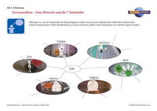 Die Schülerinnen und Schüler setzen sich nun mit dem Einfluss der Todsünden auf ihr eigenes Leben auseinander. Zunächst überlegen sie, in welchen Situationen sie selbst schon der Verführung der Todsünden erlegen sind, und ordnen diese mithilfe einer Mindmap. Daran kann sich eine Diskussion in der Klasse anschließen, inwiefern die Todsünden für die Jugendlichen heute tatsächlich noch eine Rolle spielen.