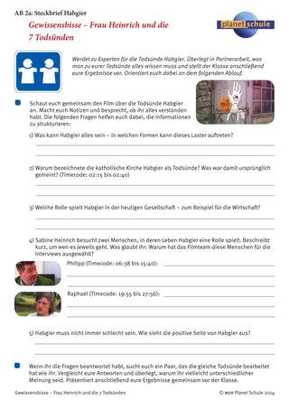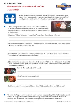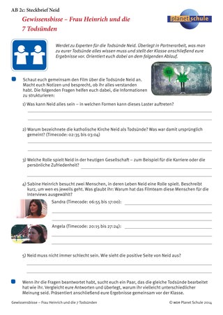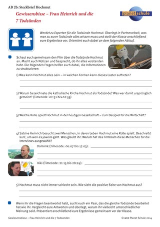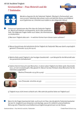 Mithilfe von leitenden Fragen auf dem Arbeitsblatt machen sich die Jugendlichen zu den Filmen Notizen. So entsteht eine Art Steckbrief zu jeder der sechs bearbeiteten Todsünden. Anschließend tauschen sich die Schülerinnen und Schüler mit dem jeweiligen arbeitsgleichen Paar aus und ergänzen ihre Stichworte. Durch den Austausch der Arbeitspaare sind zu jeder Todsünde Arbeitsgruppen entstanden. Sie stellen nun der Klasse "ihr" Laster vor. Die Steckbriefe können anschließend in der Klasse aufgehängt werden.