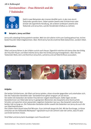 Anschließend stellen die Schülerinnen und Schüler anhand von vorgegebenen Situationen den inneren Konflikt nach, in den man durch die Todsünden geraten kann. Dabei spielen jeweils zwei Schüler die eigentliche Handlung, andere fungieren als "Gedankensprecher": Sie verkörpern jeweils eine Todsünde und versuchen, auf die Handelnden Einfluss zu nehmen. Wenn sie sich äußern wollen, legen sie dem handelnden Schüler eine Hand auf die Schulter. Die Handlung hält so lange an.