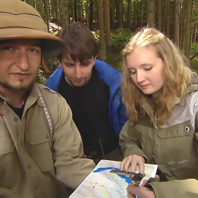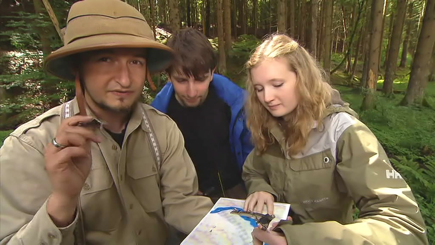 Die Grundlagen der Konstruktion erläutert Mathelehrer Basti Wohlrab an einem ungewöhnlichen Ort: im Wald. Für eine Schatzsuche müssen die beiden Schüler eine Mittelsenkrechte zwischen zwei Bäumen konstruieren und später den Mittelpunkt zwischen drei Bäumen bestimmen – als den Mittelpunk in einem Dreieck.