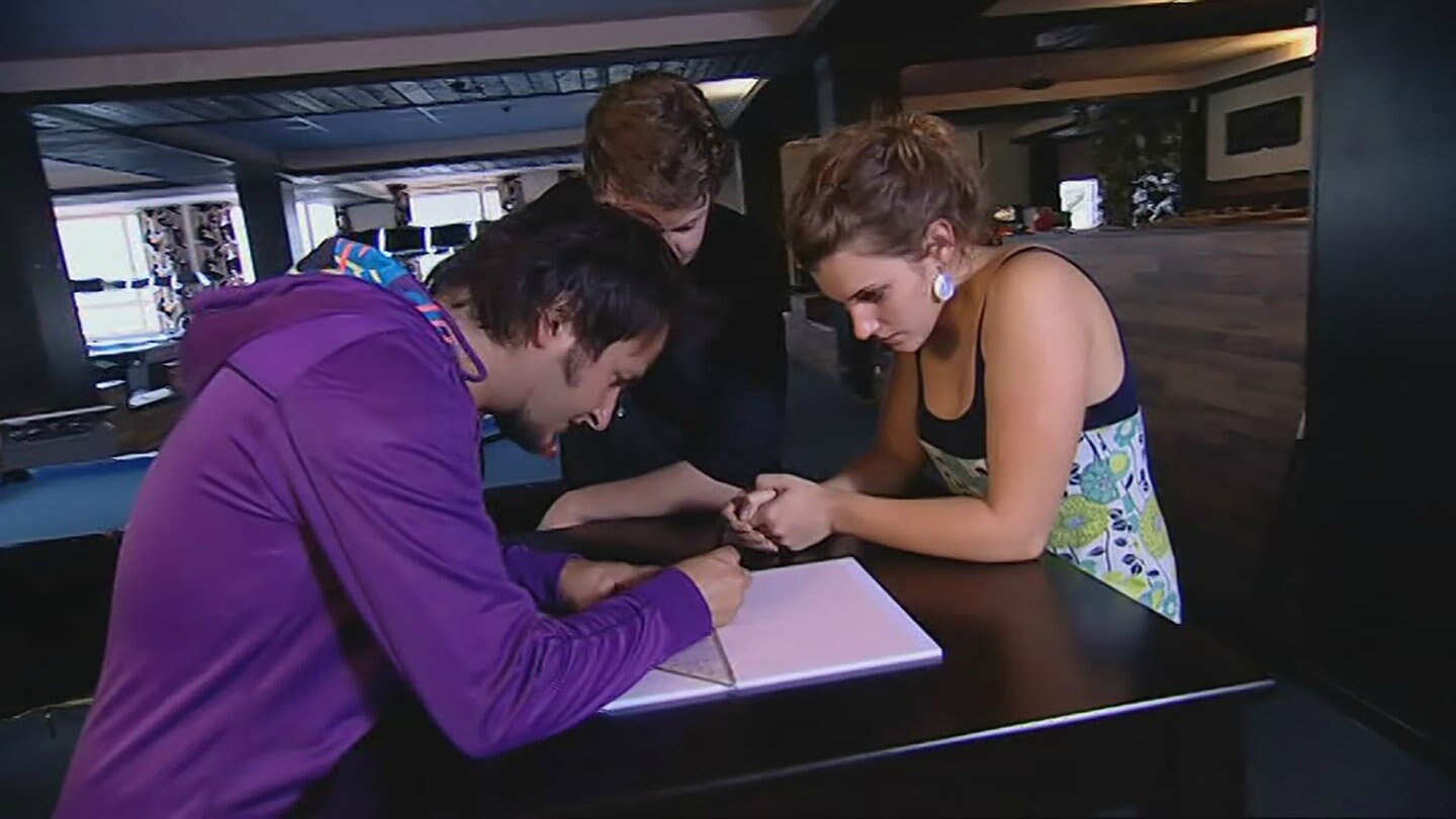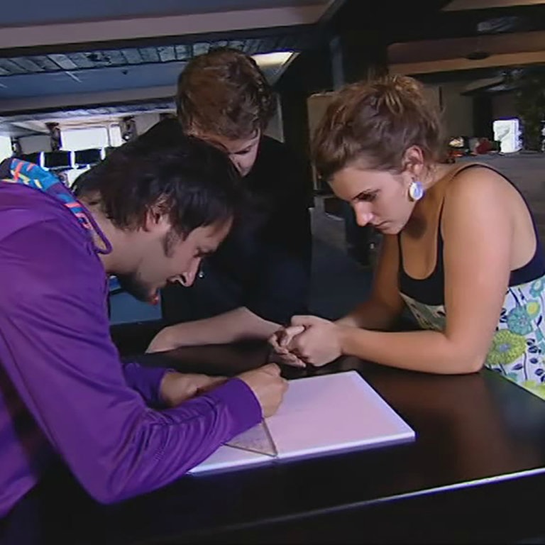 Zuerst konstruieren die drei aus dem Billardtisch ein Koordinatensystem und bestimmen die Koordinaten der Kugeln. Dann konstruieren sie auf dem Papier ein Koordinatensystem. Anschließend verrät Basti, wie man mithilfe eines Spiegels vorhersagen kann, wohin sich eine Kugel bewegt. Der Trick: Er arbeitet mit einer Spiegelachse.