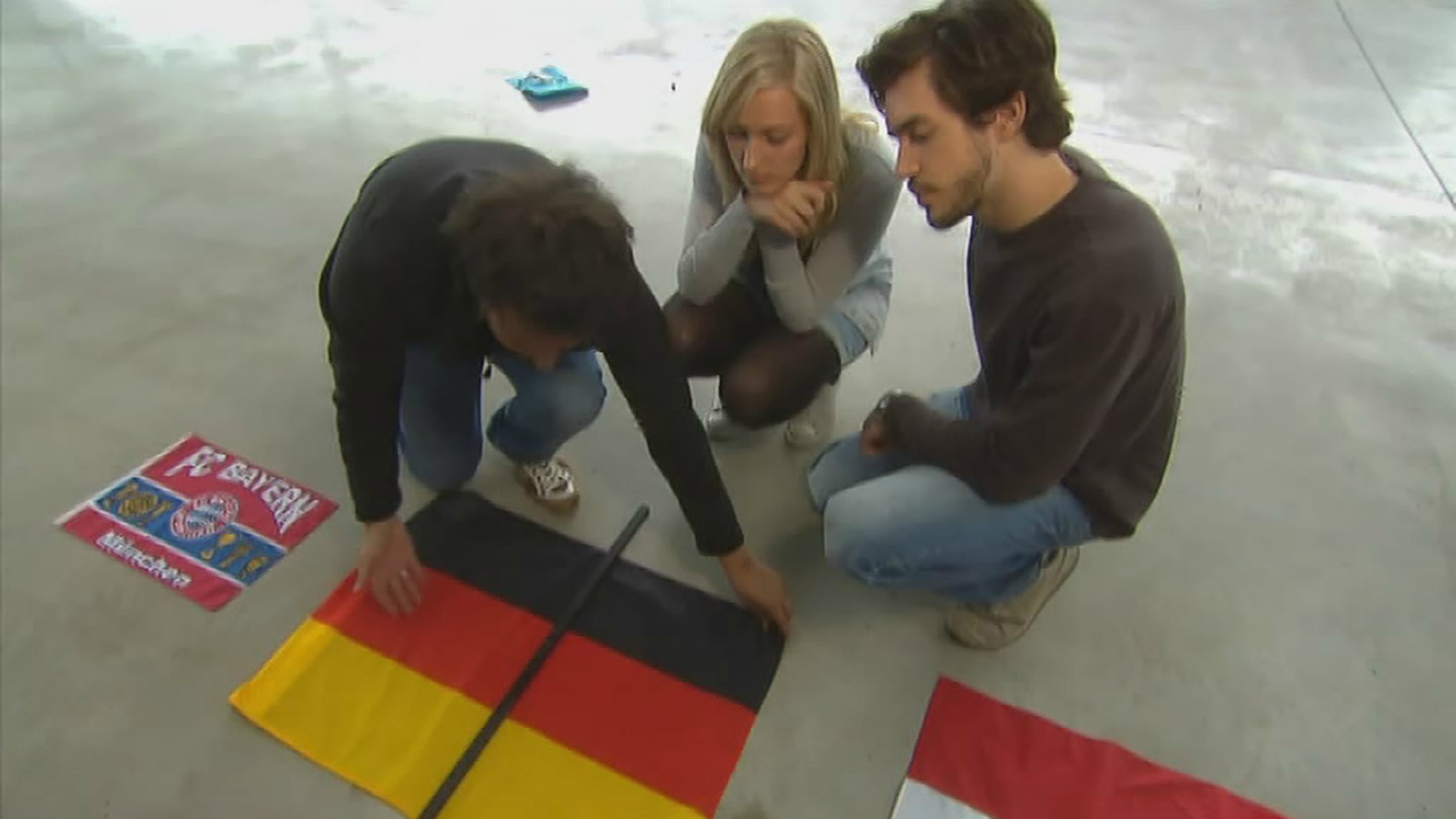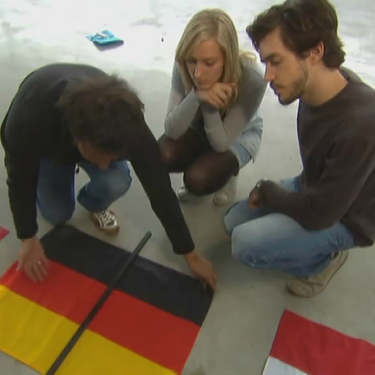 An einem Rotor erklärt Basti die Drehsymmetrie, und mit dem Scherenschnitt in einem doppelt gefalteten Papier gestaltet das Team selbst drehsymmetrische Formen. Die Punktsymmetrie erklärt Basti an Spielkarten. An verschiedenen Flaggen testet das Team dann, ob Symmetrien erkennbar sind.