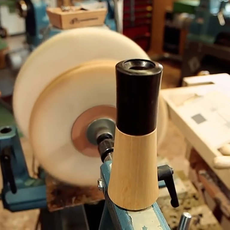 In seiner Drechselstube in Neckarsteinach am Neckar drechselt Martin Weinbrecht kunsthandwerkliche Holzprodukte – von Obstschalen bis zu Pfeffermühlen.