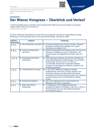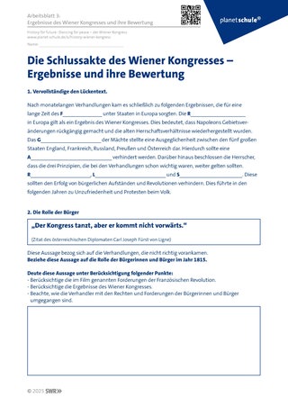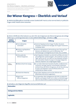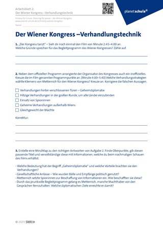 Die Schülerinnen und Schüler erarbeiten mithilfe des Arbeitsblatts 2 – Der Wiener Kongress – Verhandlungstechnik und Ausschnitten aus dem Film die Bedeutung des diplomatischen Begleitprogramms beim Wiener Kongress sowie die Verhandlungstechnik Metternichs. Sie erstellen eine Übersicht über die wichtigen Verhandlungsergebnisse (Arbeitsblatt 3 – Ergebnisse des Wiener Kongresses), welche sie kritisch einordnen müssen.
