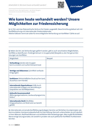 Material: Film „Dancing for peace“, 4 Arbeitsblätter, digitales Display, PC/Tablet