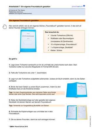 Arbeitsblatt 7 ist eine Anleitung für die Gestaltung eines eigenen „Freundebuches“, welches mithilfe der beiden Materialblätter im Kunstunterricht oder als Hausaufgabe gestaltet werden kann.