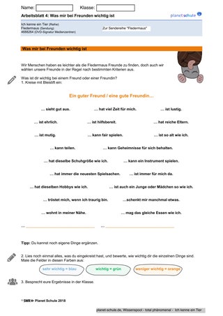 Die zweite Erarbeitungsphase widmet sich ganz dem Thema „Freundschaft“. Mithilfe von Arbeitsblatt 4 sollen sich die Schülerinnen und Schüler bewusst werden, was ihnen bei ihren Freunden wichtig ist und erkennen, dass „innere Werte“ deutlich wichtiger für gute Freundschaften sind als Äußerlichkeiten. In einem Klassengespräch können die Ergebnisse diskutiert werden.