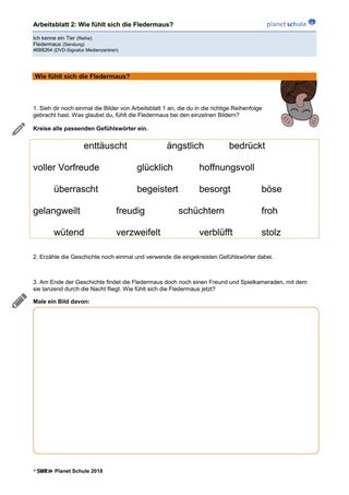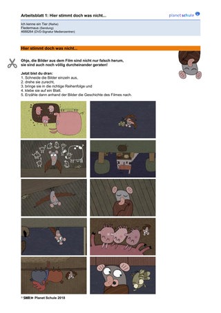In der ersten Erarbeitungsphase geht es darum sicherzustellen, dass der Inhalt des Filmes richtig verstanden wurde. Hierzu werden die Arbeitsblätter 1 und 2 in Einzelarbeit bearbeitet, wobei auf Arbeitsblatt 1 die chronologische Reihenfolge der Geschehnisse des Filmes im Mittelpunkt steht und auf Arbeitsblatt 2 die Gefühlswelt der Hauptfigur (Fledermaus) näher beleuchtet wird. Einzelne Schülerinnen und Schüler sollen die Geschichte (mündlich) nacherzählen, so wird gewährleistet, dass anschließend alle denselben Kenntnisstand haben.