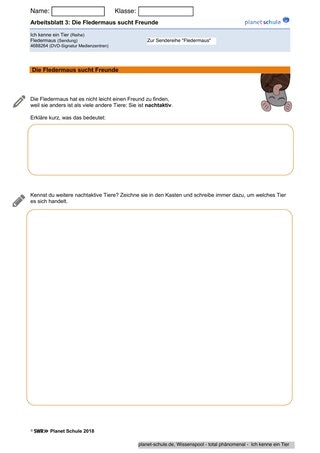 Arbeitsblatt 3 bietet Anknüpfungspunkte zur Vertiefung und/oder Weiterarbeit an den Themen „Die Fledermaus“ oder „nachtaktive Tiere“. Das (Vor-)Wissen der Schülerinnen und Schüler kann hiermit abgefragt werden, ebenso kann das Arbeitsblatt der Wiederholung dienen, falls diese Themen bereits behandelt wurden. Die Aufgaben können in Einzel- oder Partnerarbeit erledigt werden.