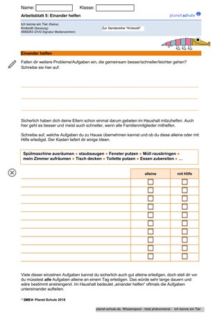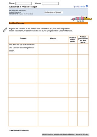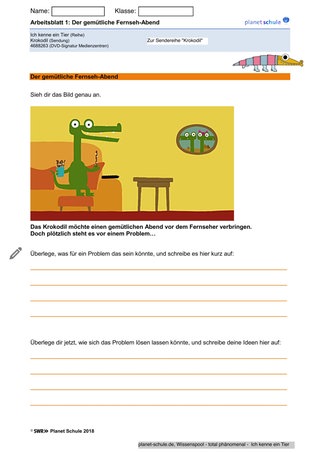 Bevor sie den kompletten Film ansehen, sollen sich die Schülerinnen und Schüler anhand des Arbeitsblattes 1 mit einem Screenshot aus dem Film beschäftigen. Sie sollen das Bild aufmerksam betrachten und anhand des vorgegebenen Halbsatzes eigene Ideen entwickeln, vor welchem Problem das Krokodil wohl stehen könnte. Ihre ersten Gedanken können die Schülerinnen und Schüler dann weiterentwickeln und in Form einer kurzen Geschichte auf Arbeitsblatt 2 ausführen. Im Plenum sollten dann circa fünf Geschichten von freiwilligen Schülerinnen und Schülern kurz vorgestellt werden.