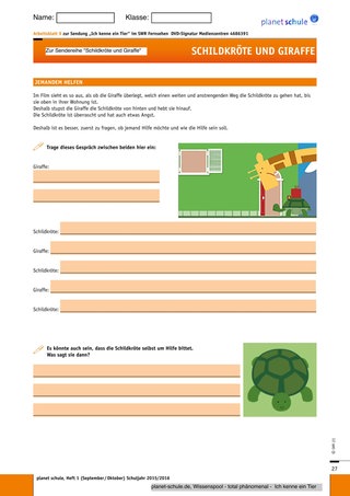 Gruppenarbeit: je vier Schülerinnen und Schüler besprechen, wie sich die Schildkröte fühlt, während die Giraffe sie hochhebt. Sie erhalten bzw. schneiden sich eine große Sprechblase und schreiben das auf. Anschließend werden die Sprechblasen vorgestellt, aufgehängt und besprochen. Danach werden verschiedene Alternativen besprochen (s. vorheriger Punkt). Auch diese können auf Sprechblasen notiert werden. Danach schreiben die Schülerinnen und Schüler die Varianten, die ihnen am besten gefallen, auf das Arbeitsblatt 9.