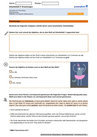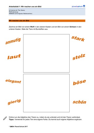 Nach dem Einstiegsspiel bearbeiten die Schülerinnen und Schüler Arbeitsblatt 1 in Einzelarbeit. Hier geben sie die optischen Merkmale der ausgewählten Tiere in Form einer Zeichnung wieder und ordnen den Tieren vorgegebene (und eigene) Eigenschaften zu. Somit rücken zwei der Tiere aus dem Ratespiel in den Fokus und es wird das vertieft, was im Ratespiel bereits angedeutet wurde: Die mit den Tieren verknüpften (menschlichen) Eigenschaften und unsere „Erwartungen“ an oder gar Vorurteile gegenüber diese(n) Tiere(n).