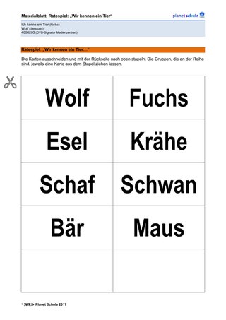 Die Unterrichtssequenz beginnt mit einem kleinen Ratespiel. Hierzu wird die Klasse (je nach Klassengröße) in drei bis vier Großgruppen (zu je 5 bis 8 Schülern) eingeteilt. Eine Gruppe beginnt. Sie erhält ein Tier mithilfe der vorbereiteten Karten des Materialblattes vorgegeben und soll dieses (mit Worten, ohne Tierlaute nachzuahmen) möglichst genau beschreiben. Jede Gruppe beginnt mit dem Satz: „Wir kennen ein Tier, das …“ Sobald eine andere Gruppe das Tier erraten hat, ist sie an der Reihe.