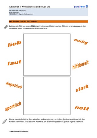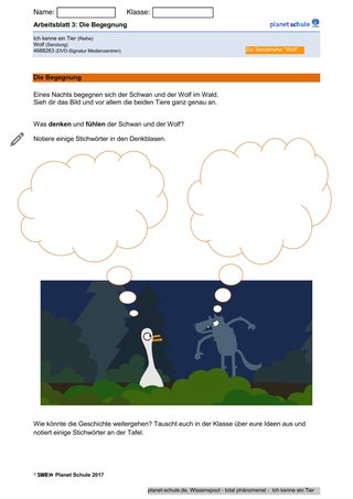 Arbeitsblatt 3 soll zum Film hinführen und kann im Anschluss an die Präsentation der Geschichten ausgeteilt werden. Zunächst sollen die Schülerinnen und Schüler in Einzel- oder Partnerarbeit notieren, was die beiden abgebildeten Tiere denken und fühlen. Dies ist besonders wichtig, da der Film ohne Sprache/Dialoge auskommt und die Schülerinnen und Schüler sehr genau auf die Mimik und Gestik der Tiere achten müssen. Diese Aufgabe können sie anhand des Arbeitsblattes vorab „üben“.
