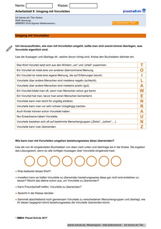 Abschließend befassen sich die Schülerinnen und Schüler mithilfe von Arbeitsblatt 9 damit was Vorurteile sind und wie sie damit umgehen beziehungsweise diese überwinden können. Nachdem die Schülerinnen und Schüler das „Rätsel“ im oberen Teil in Einzel- oder Partnerarbeit gelöst haben, ist es wichtig den Begriff „Toleranz“ zusammen mit der Lehrkraft zu definieren und die auf dem Arbeitsblatt genannten Fragestellungen zu diskutieren. Auf diese Weise können die Schülerinnen und Schüler Strategien entwickeln, Vorurteilen richtig zu begegnen.