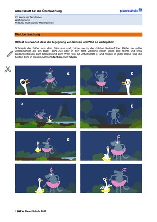 Um den Überraschungseffekt der Filmhandlung zu verstärken soll die Klasse gemeinsam überlegen, wie die Begegnung zwischen Schwan und Wolf weitergehen könnte. Es ist anzunehmen, dass die Ideen sich weiterhin der bisherigen Vorurteile bedienen.