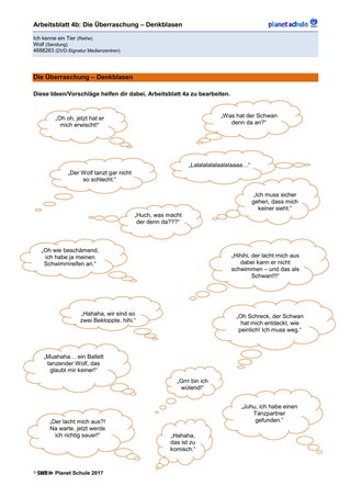 Bei der Hausaufgabe (Arbeitsblatt 4a) sollen sich die Schülerinnen und Schüler die Handlung des Filmes noch einmal bewusst machen, indem sie die Bilder in die richtige Reihenfolge bringen und zu jedem Bild die Gedanken und/oder Gefühle der Tiere notieren. Arbeitsblatt 4b (mit vorgefertigten Denkblasen) dient als Hilfestellung für die schwächeren Schülerinnen und Schüler, es kann, muss aber nicht jedem ausgeteilt werden.