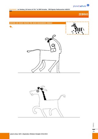 Als Vorbereitung auf den Filmeinsatz im Vorschulbereich und den Beginn der Grundschule: Impulsbild Zebra. Das Zebra entdeckt, dass die Streifen verrutscht sind. Das Bild wird ausgedruckt oder über Laptop und Beamer projiziert. Frage: „Was ist hier passiert?“.