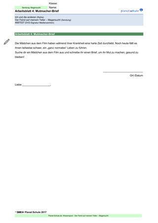Im Anschluss suchen sich die Schüler nun eine der drei Protagonistinnen aus, um ihr einen Brief zu schreiben, in dem Mut zum Gesundbleiben zugesprochen werden soll (Arbeitsblatt 4). Hierbei setzen sich die Jugendlichen noch einmal individuell und einfühlend mit dem Schicksal eines der Mädchen auseinander, um diesem Stärke zuzusprechen. Das soll den Schülern helfen, in einer ähnlichen Situation des eigenen Lebens durch Einfühlungsvermögen anderen Menschen gegenüber eine Unterstützung zu sein und sich gleichzeitig auch selbst in schwierigen Lebenssituationen Mut zuzusprechen. Im Plenum können nach Wunsch einige Briefe vorgelesen werden.