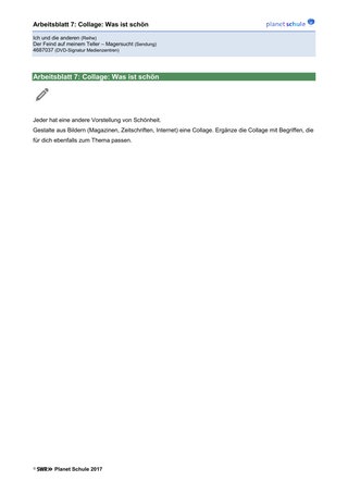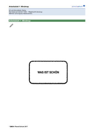 In Partnerarbeit füllen die Schüler nun ihre eigene Mindmap (Arbeitsblatt 1) aus, bei der zu Tage tritt, was der einzelne Schüler unter „schön“ versteht. Durch einen weiteren Partnerwechsel, bei dem die Ergebnisse verglichen werden, wird schnell deutlich, dass es unterschiedliche Vorstellungen von „schön“ gibt. Dies stellt eine Überleitung zum Film dar.