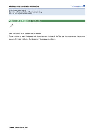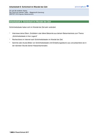 | Hausaufgabe (Wahlaufgaben) | - Arbeitsblatt 6 - Schönheit im Wandel betrachtet (Rechercheaufgabe) - Arbeitsblatt 7 - Collage zum Thema „Was ist schön“ - Arbeitsblatt 8 - Liedtexte zum Thema Schönheit (Rechercheaufgabe) | Einzelarbeit | - Arbeitsblatt 6 - Schönheit im Wandel - Arbeitsblatt 7 - Collage „Was ist schön“ - Arbeitsblatt 8 - Liedertext- Recherche |