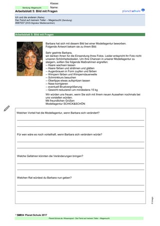 Um nun den Bogen zum Anfang der Stunde zu schlagen, wird den Schülern zuletzt noch einmal das Modellbild vom Einstieg gezeigt. Provokant wird hierbei vorgegeben, dass die Person auf dem Bild nicht schön genug sei, um ein Schönheitsideal darzustellen. Daraufhin werden ihr von einer fiktiven Modellagentur Tipps zur Steigerung der Schönheit empfohlen. Die Schüler sollen sich nun kritisch damit auseinandersetzen, welche Vorteile die Modellagentur und auch die Schönheitsindustrie davon haben, wenn besagte Person die Tipps annimmt. Dadurch sollen die Schüler hinter die Kulissen der Schönheitsindustrie blicken, um zu erfahren, dass Schönheit auch ein Geschäft ist, woran sich viele Firmen auf Kosten anderer bereichern. Dies soll die Schüler befähigen, einen kritischen und geschärften Blick im Umgang mit Schönheitsprodukten, aber auch mit Schönheitsidealen im Allgemeinen zu erlangen.