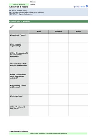 Um sich während des Films einen Überblick zu verschaffen, wird den Schülern eine Tabelle (Arbeitsblatt 2) ausgeteilt, in welche sie die Informationen über die drei Protagonistinnen eintragen können. In diesem Falle kann es nützlich sein, die Fragen aus der Tabelle kurz mit den Schülern zu besprechen.
