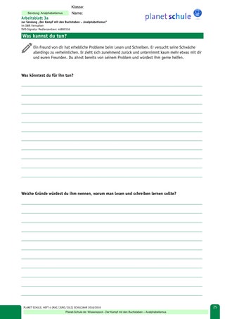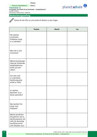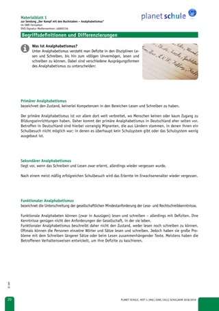 Materialblatt 1 bietet eine Übersicht über die unterschiedlichen Ausprägungsformen des Analphabetismus. Noch vor der Sichtung des Films sollte in der Anfangsphase des Unterrichts eine genaue Begriffsklärung erfolgen. Verstärkt sollte hier vor allem auf den Begriff ‚Funktionaler Analphabetismus‘ eingegangen werden, damit es nicht zu Missverständnissen kommt.