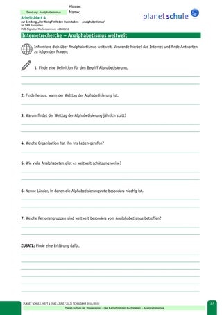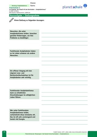 Hausaufgabe 1 (Arbeitsblatt 4) bietet die Möglichkeit, sich mit dem Analphabetismus weltweit auseinanderzusetzen. Die Schüler sollen hierbei im Internet recherchieren und unterschiedliche Fragen beantworten. Alternativ kann auch die Hausaufgabe 2 (Arbeitsblatt 5) genutzt werden. Die Schüler sollen Stellung zu unterschiedlichen Aussagen über den Analphabetismus nehmen und diese Position begründen.