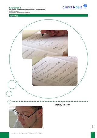 Die Lehrkraft kann mithilfe der Fragen „Wie alt könnte die Person sein?“ oder aber „In welcher Klasse / Schule könnte sich die Person befinden?“ Denkanstöße unterstützen. Nach ersten Überlegungen kann der Lehrer transparent machen, dass es sich um den 31-jährigen Marcel handelt. In einem anschließenden kurzen Unterrichtsgespräch soll geklärt werden, ob den Schülern bekannt ist, dass man auch im Erwachsenenalter massive Defizite im Lesen und Schreiben haben kann. Falls die Schüler den Begriff des Analphabetismus nicht kennen, sollte der Lehrer ihn an dieser Stelle näher beleuchten. Weiterhin gilt es das Vorwissen der Schüler über dieses Phänomen kurz abzufragen.