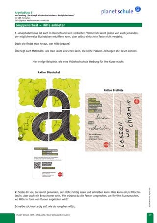 | Hinführung / Vorentlastung | Abfrage von Vorwissen / Unterrichtsgespräch über Analphabetismus | Plenum | |
