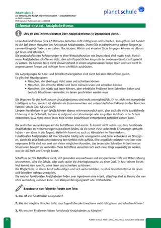 | Erarbeitung | Informationstext über funktionalen Analphabetismus in Deutschland, Bearbeitung der Fragen | Einzelarbeit | Arbeitsblatt 2 |