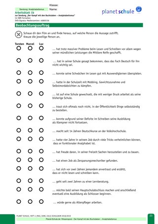 Im Film stehen drei Personen unterschiedlichen Alters im Fokus. Sie berichten von ihren alltäglichen Herausforderungen und auch darüber, wie sie es einerseits geschafft haben, sich gegenüber ihrem Umfeld zu öffnen und in welchen Bereichen sie die nötige Unterstützung erhalten haben, um sich in der Schule oder dem Beruf zurechtzufinden und sich weiterzuentwickeln. Da es sich bei den drei Protagonisten des Filmes um funktionale Analphabeten handelt, dient das Materialblatt 1 zunächst erst der Klärung der Begrifflichkeiten.