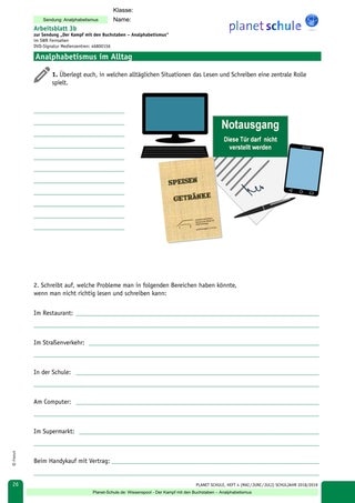 Die darauffolgende Erarbeitungsphase bietet, unterstützt durch einen Informationstext (Arbeitsblatt 2), die Möglichkeit, sich vertiefend in die Thematik einzuarbeiten. Hierbei soll eine genaue Begriffsdefinition erarbeitet und ein Blick auf Ursachen und Folgen des funktionalen Analphabetismus geworfen werden. Ziel dabei ist es, dass die Schülerinnen und Schüler hier weitere Hintergrundinformationen über die Thematik erhalten.