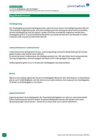 Der Film kann in den Unterrichtsfächern Gemeinschaftskunde, Sozialkunde, Ethik, Religion oder im Rahmen der Medienerziehung ab Klasse 8 eingesetzt werden. Je nach Leistungsstand der jeweiligen Lerngruppe kann in den Erarbeitungsphasen auf unterschiedlichen Niveaus gearbeitet werden. Im Film genannte Fachbegriffe wie beispielsweise „Underachiever“ oder „Mensa“ sollten vor dem Ansehen des Filmes mit den Schüler*innen kurz besprochen werden (Materialblatt 1). Ebenso sollte der Begriff Hochbegabung kurz definiert werden, damit eine einfache Reduzierung auf den Intelligenzquotienten vermieden wird.