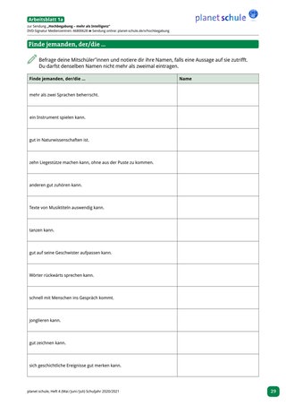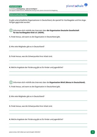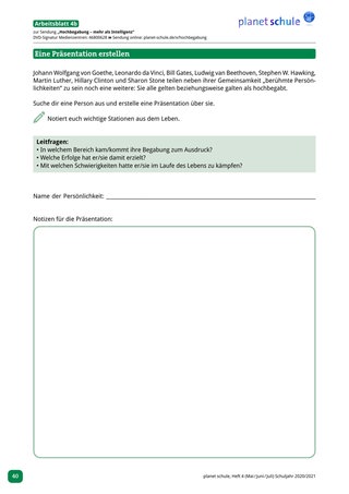 Eine weitere vertiefende Erarbeitungsphase bieten die Arbeitsblätter 4a/b. Diese können entweder am Ende der Stunde als Hausaufgabe erteilt oder alternativ auch in einer Folgestunde bearbeitet werden. Arbeitsblatt 4a leitet die Schüler*innen dazu an, im Internet nach Organisationen für Hochbegabte zu recherchieren und Informationen zu sammeln. Arbeitsblatt 4b bietet den Schüler*innen die Möglichkeit, eine bekannte hochbegabte Persönlichkeit auszuwählen und über diese eine Präsentation anzufertigen.
